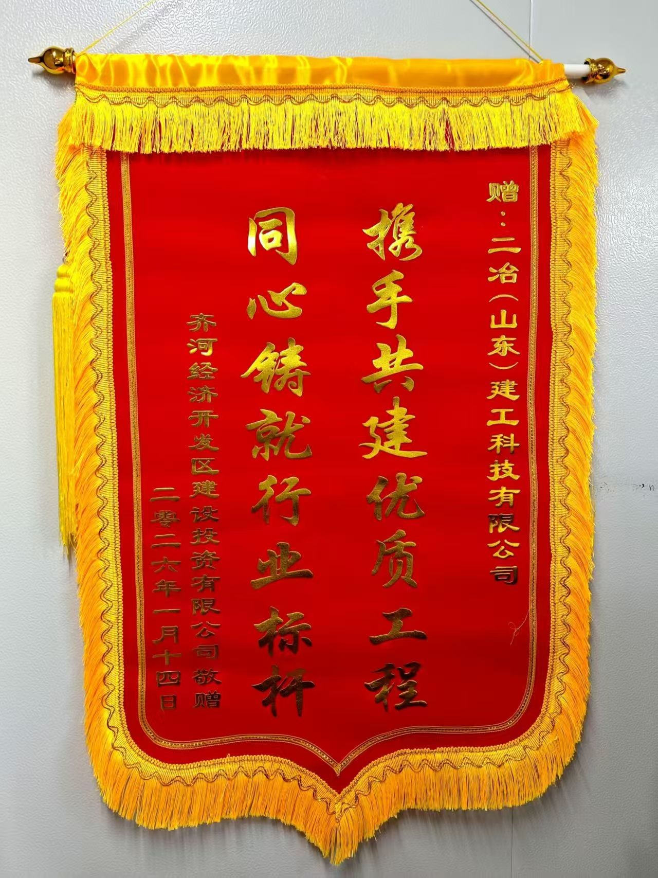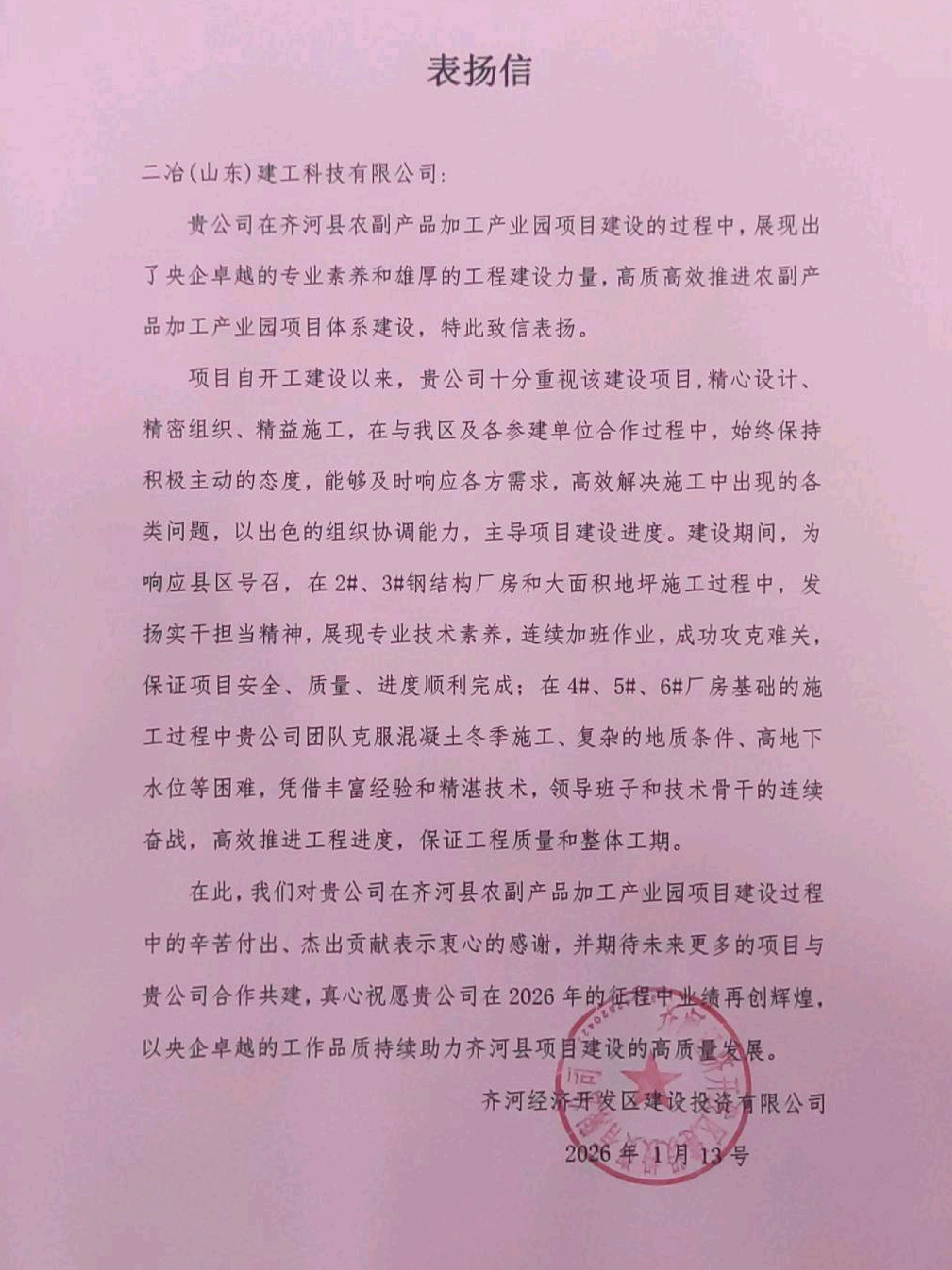 齐河经济开发区建设投资有限公司同时送来锦旗与感谢信,锦旗题词“携手共建优质工程 同心铸就行业标杆”。信中对公司在齐河县农副产品加工产业园项目建设中的辛勤付出与突出贡献致以诚挚谢意。