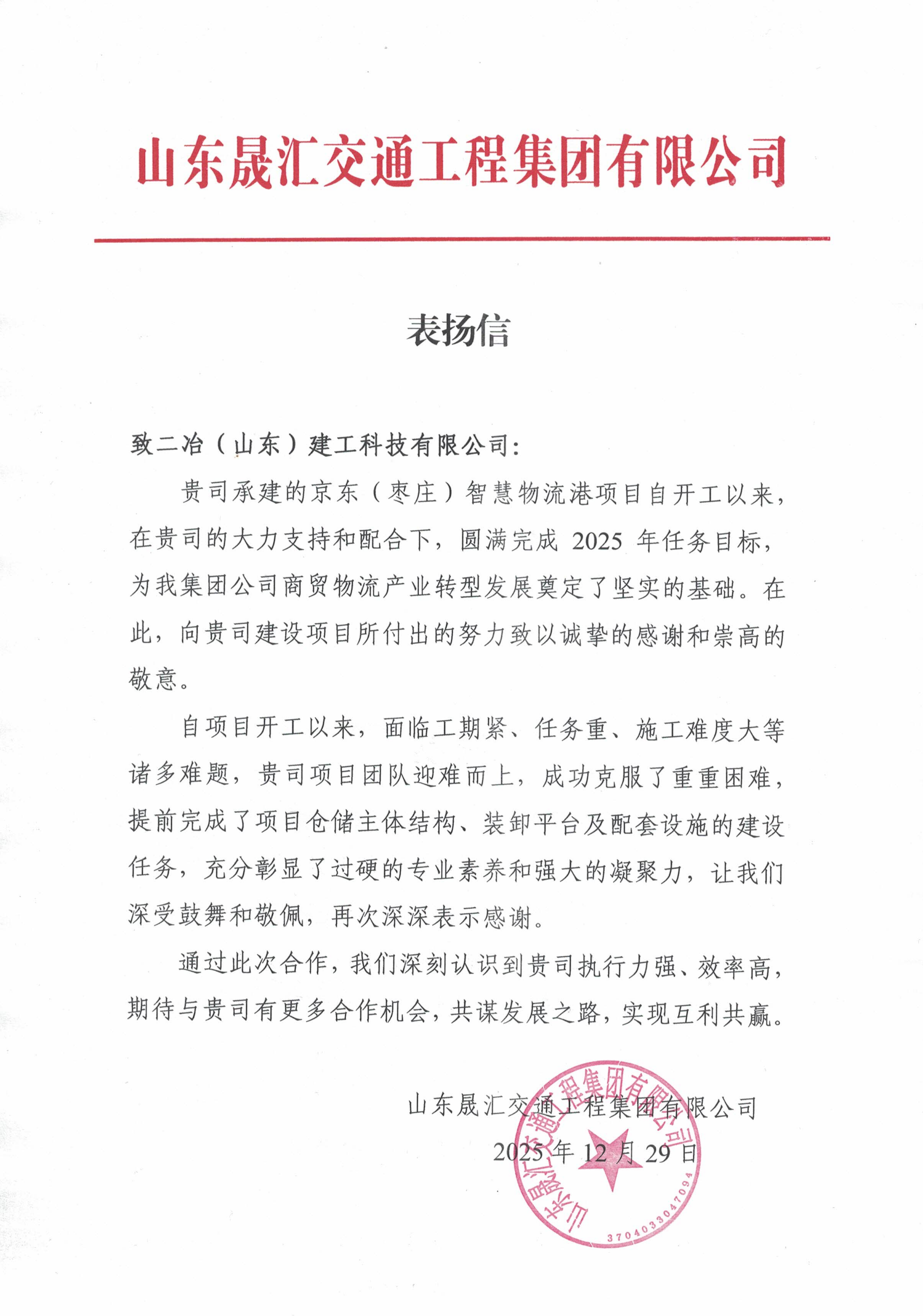 此外,山东晟汇交通工程集团有限公司也发来表扬信,对京东(枣庄)智慧物流港项目团队凭借过硬的专业素质与高度凝聚力,提前达成项目建设目标给予充分肯定。