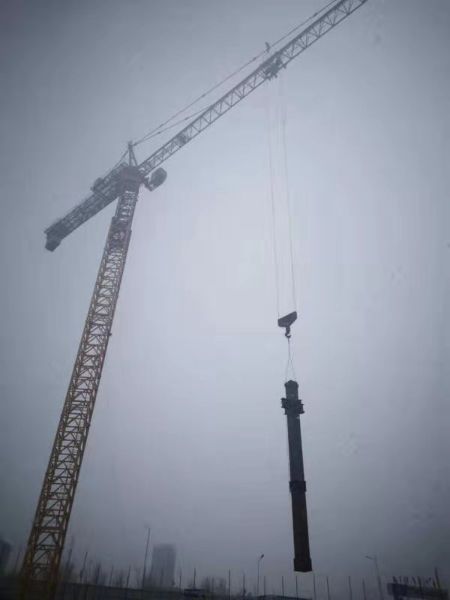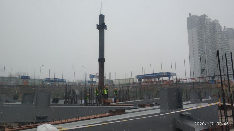 首根钢柱为箱型结构,重量超8吨,放置于负二层的顶板上。整个吊装的过程必须要做到万无一失,既要保证钢柱的顺利起吊,也要保证过程中不能对楼板造成损害。项目部组织人员一丝不苟、认真细致的做好每一道工序的准备工作:在钢柱的吊装区域拉起警戒线、清扫构件和周边的积雪、再次确认轴线和标高的精度、反复叮嘱安装人员和塔吊司机注意事项和确保安全。