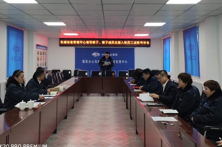 1月17日上午,建安分公司党委副书记尹旭带领党群工作部、人力资源部相关人员一行三人到机械设备管理中心对机械设备管理中心领导班子、班子成员、新入职员工和一般管理人员进行述职考核测评,机械设备管理中心班子成员、全体管理人员及部分职工代表参加了述职考评会。