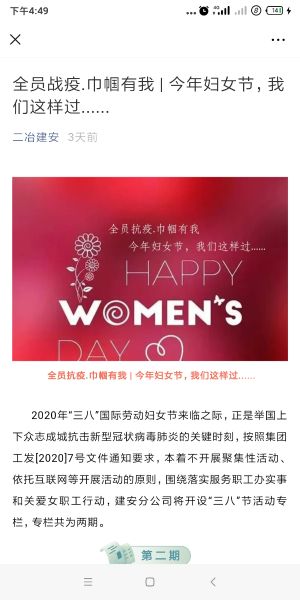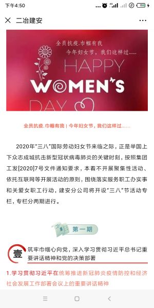 3月8日,建安分公司借助微信公众平台以“全员抗疫.巾帼有我,今年妇女节,我们这样过......”“三八”节活动,并以此为题刊发两期微信,组织女职工通过微信公众平台刊发微信的形式进行学习。