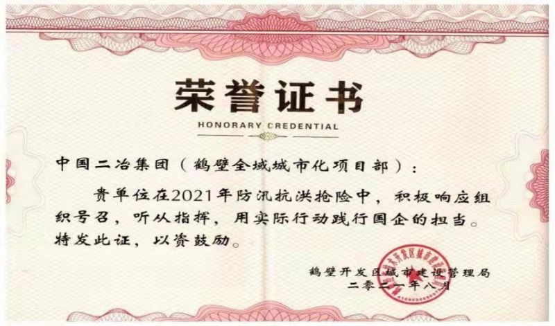 9月1日,河南省鹤壁市开发区城市建设管理局为中国二冶集团中原分公司鹤壁项目部颁发了荣誉证书,肯定了该项目部在防汛抗洪工作中做出的突出贡献。