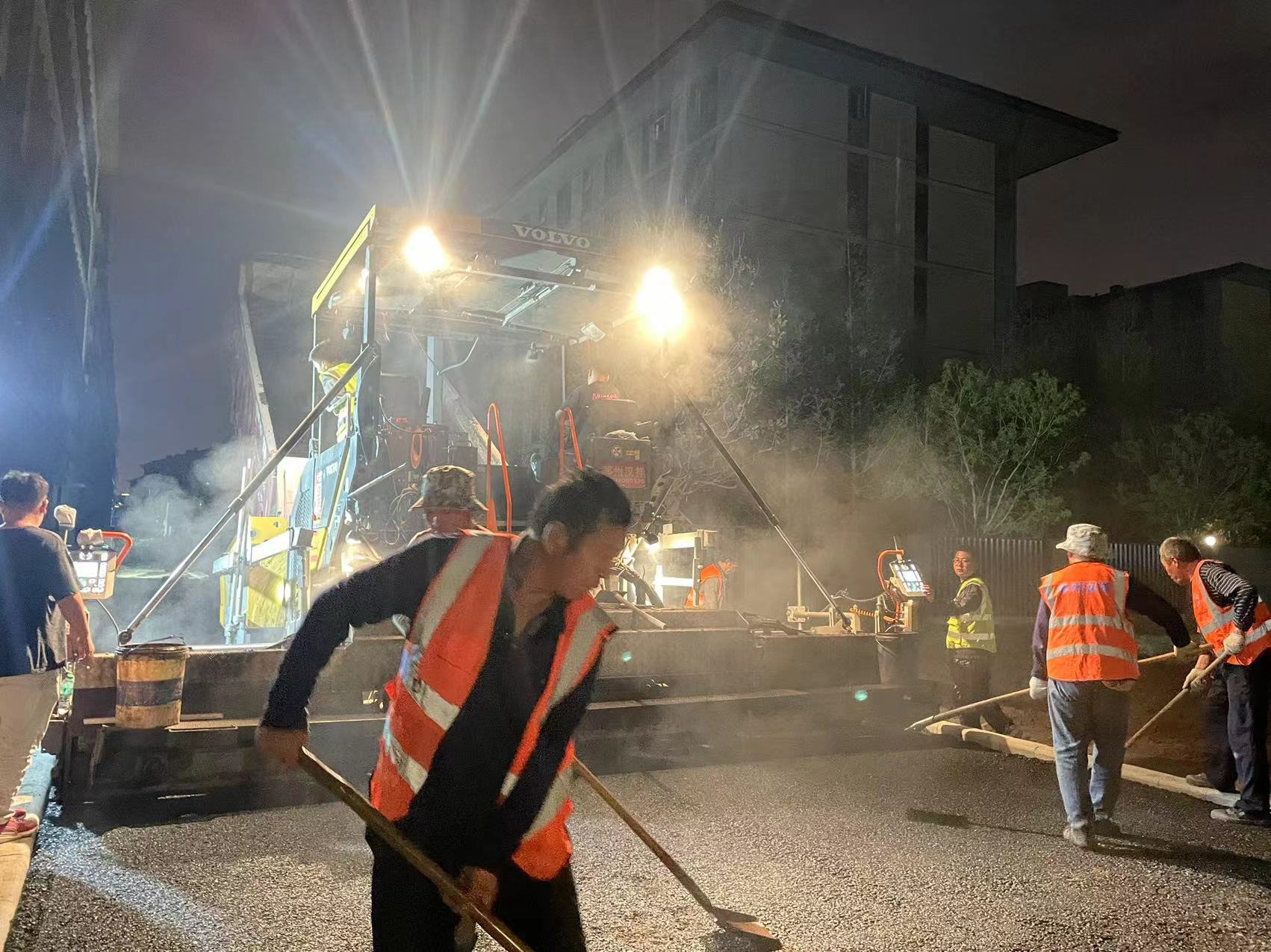 为加快工程进度,项目团队制定了科学的夜间施工方案,明确施工内容、时间节点以及对应项目责任人,组织开展夜间施工作业。不仅抓工程进度,更注重抓工程质量。同时,做好夜间施工的安全管理工作,及时发现施工进程中存在的问题,排除安全隐患。在沥青摊铺前,项目进行了严格细致的技术交底,摊铺过程中,在源头把控原材料质量,对施工各环节进行全程监控,从摊铺厚度、沥青混合料到场温度以及摊铺表面平整度等方面严格把控,以确保面层沥青摊铺工作的优质、高效完成。在全体人员的共同努力下,最终顺利完成如意东路便民服务中心项目沥青道路施工。