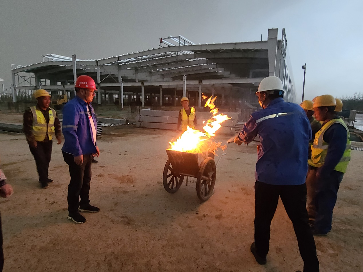为进一步加强施工现场安全管理,提升火灾应急救援水平,提高员工消防安全意识和自救互救能力,营造安全、稳定、和谐的施工现场环境,4月30日,利用晚饭后下班时间,中原分公司浚县先进制造业开发区生物基可降解材料产业园项目经理部,按照“消防应急预案”的相关要求,项目部管理人员及分包单位员工在2#生产车间南侧现场道路上开展消防应急演练活动。