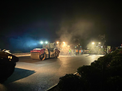 昼夜连续作业,“快”字至上。全线分四个工区段,项目部根据施工计划,落实责任目标,将每日目标工程量表格分发至每位工区段经理、施工队手中,对完成任务有困难的施工队,及时督促其上足人员和机械,每天24小时倒班作业。现场技术员、安全员守施工现场,积极与施工队伍协调沟通,科学合理调配人员,主动协助其解决施工生产中遇到的困难和问题;狠抓交底培训,“质”字保障。抢抓进度的同时,筑牢安全质量生命线不可松懈。项目部严格执行技术交底制度,使施工人员对工程技术质量要求、施工方法与措施等方面有详细的了解,避免出现返工现象。试验室现场检测路基压实度、弯沉值、沥青路面芯样稳定度等数据,沥青摊铺严格控制摊铺过程中的质量问题,现场技术员,看图纸,认真测量,把控安全关,一丝不苟;及时归纳整理,“笔”字记录。