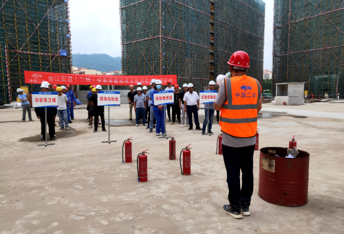 此次演练是模拟在项目施工现场因焊接钢筋时引燃木料废品发生的火情下进行。消防应急演练前,项目部安全生产负责人详细介绍了施工用电以及安全防火注意事项,对正确使用消防器材、火灾扑救及发生火灾时如何逃生等安全知识进行了讲解。并现场演示了灭火器的使用方法,组织施工(作业)人员现场体验灭火器的使用操作规范。