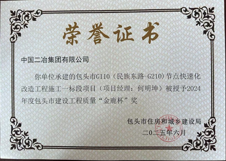 近日,从包头市传来喜讯,市政分公司包头市G110(民族东路-G210)节点快速化改造工程施工一标段项目凭借卓越的工程质量和出色的项目管理,成功斩获包头市建设工程质量“金鹿杯”奖。这一奖项的获得,不仅是对该项目全体建设者辛勤付出的高度认可,更是公司在建筑领域实力与口碑的有力见证。