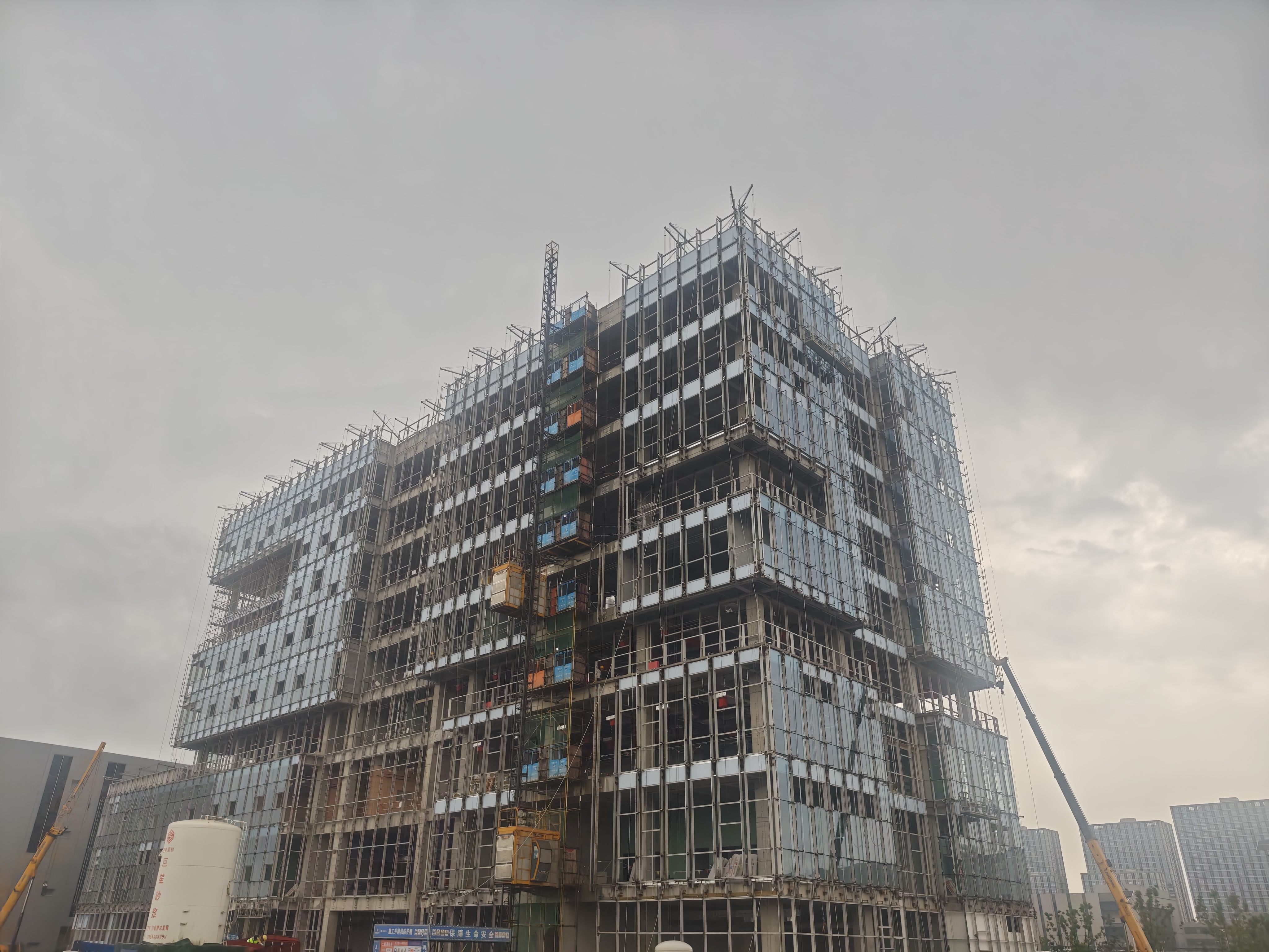 走进项目施工现场,繁忙有序的氛围扑面而来:室内装饰装修工作紧锣密鼓推进,施工人员紧盯墙面平整度、地面光洁度等关键细节,每一处工序都严格对标高科技芯片研发与生产的严苛环境要求,确保研发楼与生产厂区的内部空间既满足功能需求,又符合精密制造的洁净标准;室外玻璃幕墙施工同步展开,一块块兼具强度与节能性能的高性能玻璃,在机械协作与人工校准的配合下精准安装,未来将勾勒出兼具现代美感与科技质感的建筑外观,为产业园区增添独特辨识度。值得一提的是,项目团队在赶进度、保质量的同时,始终严守绿色建造理念,从环保材料选用到节能设备投入全程把控,力求实现工程品质与生态效益的双向共赢,让产业发展的 “科技感” 与绿色发展的 “生态感” 相得益彰。