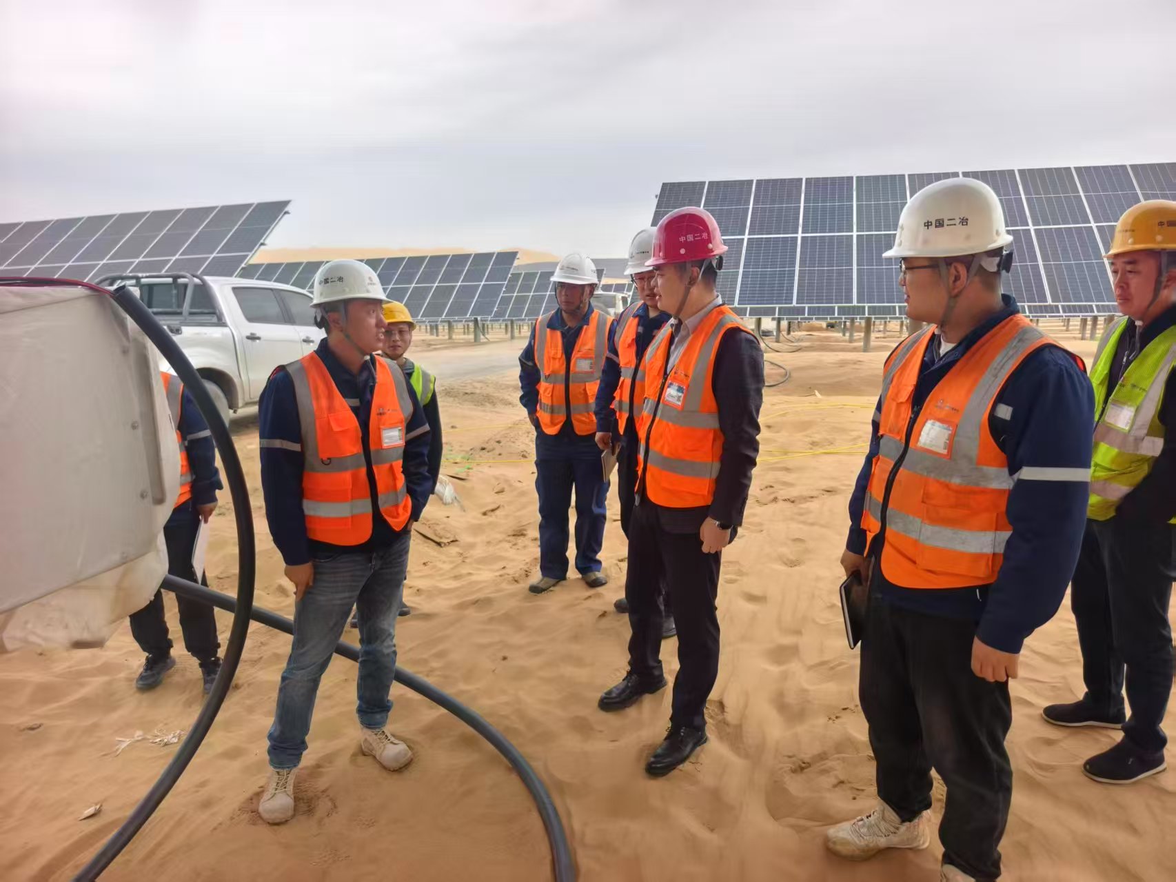 米宏达深入各子阵查看光伏组件的安装质量和布局情况,确保光伏组件的安装符合标准,以提高发电效率。同时,针对项目建设核心需求,米宏达提出三点要求,一是安全管理上,需针对沙漠施工风沙、高温等风险,加强人员安全教育培训与现场管控,增设警示标志、配齐防护设备,守住安全生命线;二是质量把控上,坚持“质量第一”,从设备采购到安装调试全环节严把关,建立问题台账实行闭环管理,打造高标准工程;三是进度推进上,围绕2025年11月15日并网目标,制定详细施工计划,加强多部门协调,快速解决建设难题,确保按期完工。