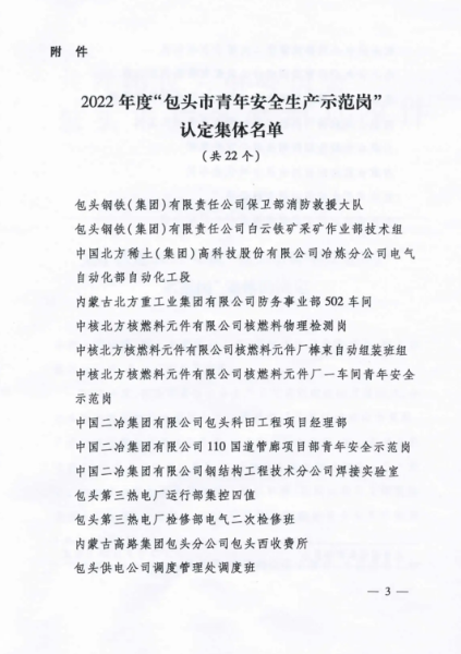 9月26日,共青团包头市委员会、包头市应急管理局公示了2022年度“包头市青年安全示范岗”集体的项目名单。中国二冶钢构分公司焊接实验室荣获“包头市青年安全示范岗”集体荣誉称号。