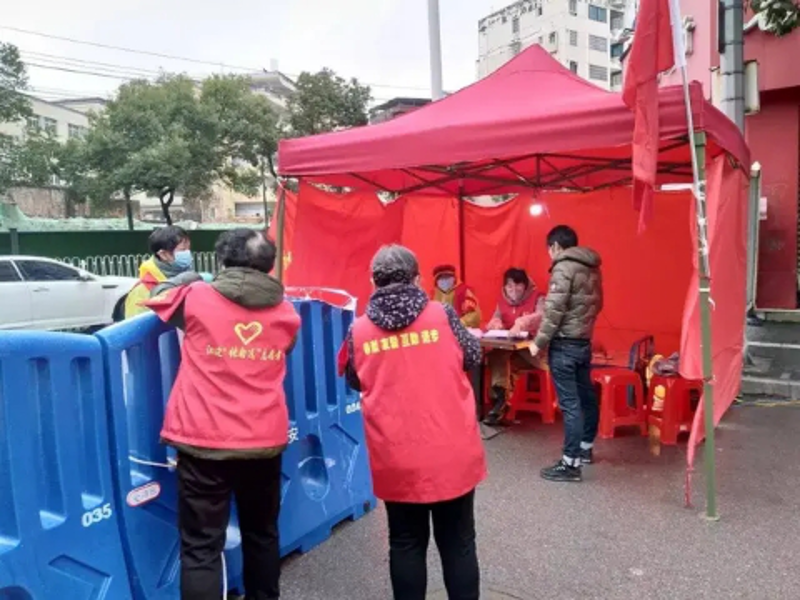 图为社区工作者在核实登记社区来访人员信息