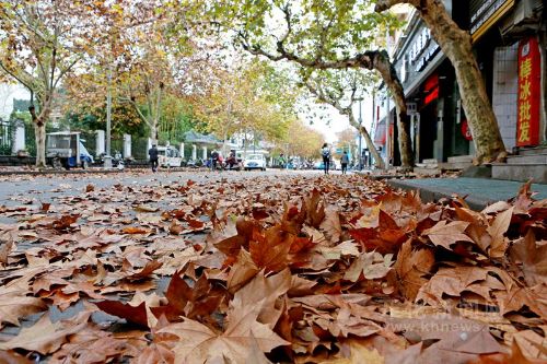 曾经也是满树葱绿,曾经也是满目芳华。从春日绿意萌动,到夏日里的郁郁葱葱枝繁叶茂,再到秋日里的筋骨毕露芳华不再,梧桐落叶从容淡定地回归到大地母亲的怀抱。梧桐树,把最美的年华都奉献给人类,把最好的青春都展示给人类,梧桐树叶在生命的最后时刻仍然“化作春泥更护花”,这是多么崇高的境界和胸怀!金陵之秋的绝代风华因梧桐叶落而多姿多彩!
