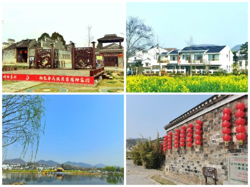 山水灵动,风光秀美,湖光山色尽收眼底。佘村座落于青龙山,黄龙山,横山三山环抱之中。其南临双龙湖,湖水碧波荡漾,野鸭悠闲自在地畅游,不时有水鸟从湖上掠过。湖边的梅树遒劲枝干上盛开着粉白色的花朵。极目远眺,群山绵延,油菜花海一片,近处距今300多年的徽派古建筑群,一座座错落有致的白墙黛瓦整洁的农居,俨然是一幅美丽田园的丹青画卷。