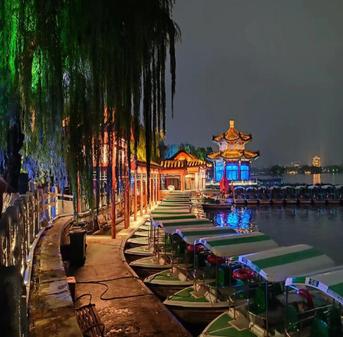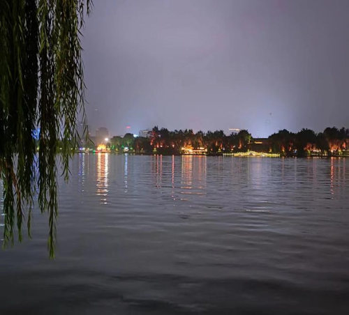 晚上闲暇时刻突发意念,便想起去大明湖夜游。大明湖湖面宽广,湖中有几个小岛,但景观大部分在四周的沿岸。尽管坐船览湖,有披波激浪的惬意,有闲风拂面的轻松,但却是走马观花。“纸上得来终觉浅,绝知此事要躬行”,要细细地、慢慢地品赏大明湖,巧遇是一种浪漫,大明湖是适合浪漫的。虽然它不具鼓浪屿醉的人海风,更没有迷人的沙滩,不具杭州西湖那么辽阔和名气,但我觉得它是北方城市中最浪漫的湖。游大明湖,无论年龄多大,我想最好给自己一个惬意的理由,怀一颗浪漫的心。让那堤岸摇荡的垂柳,轻拂额头,撩拨久居市井而混沌的心胸,掸禅生活中沉积的尘燥。如果你意诚,柳拂是能禅心的。心明了,眼亮了,满目就会是红情绿意。整体来说大明湖景点的灯光很美,