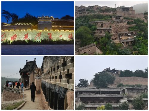 第二天早晨,太阳还未升起,小镇在一片云雾缭绕中,轻纱曼妙如同仙境一般。走进碛口古镇南3公里处的李家山村,这个村的建筑依山坐楼,多以砖拱顶(窑洞)四合院为主。在导游的带领下,一路来到昔日东财主家,院门楼上的“麒麟送子”依稀可见。导游介绍,明成化年间,李氏家族由临县下西坡村迁往此地,经世代繁衍,到清中叶已成大户。现在李家山村内共有高低九层、合计九十八院的古住宅群,是第四批中国历史文化名村、首批中国传统村落、优秀景观村落。画家吴冠中到李家山采风时惊呼:古村相对封闭,像与世隔绝的桃花源。这样的村庄,这样的房子,走遍全世界都很难再找到!李家山村形似凤凰,民居依凤身、两翼而建,错落有致地分布于70度的山坡上,构成了一种极具视觉震撼力的效果,吸引着全国各地的大批艺术家前来采风和创作。我们一行也饶有兴趣地在这里留影打卡,留作未来的美好回忆。