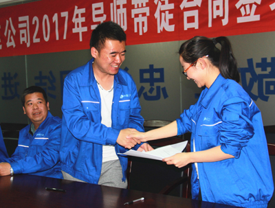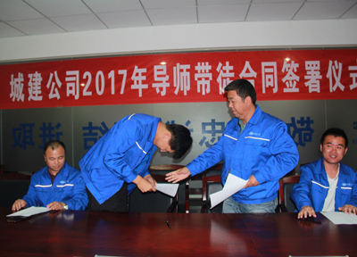 会上,城建公司人力资源部首先部署了导师带徒工作,宣布了2017年导师带徒人员名单,明确了师徒协议书期限、师傅和徒弟职责、师傅津贴及考核原则。随后,分别来自基层项目部的项目部经理、经营负责人作为师傅与新入职大学生签署合同。签署过程中,徒弟们怀着感恩的心情,深深地向师傅鞠躬,表示感谢;师傅们则带着满满的责任和浓浓的情谊,与徒弟亲切握手,互相祝福,导师带徒仪式赢得了阵阵掌声,气氛热烈而融洽。