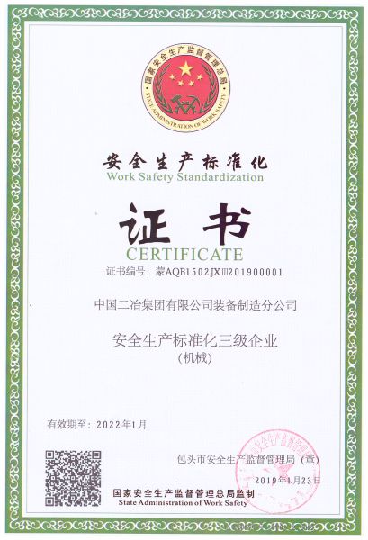 近年来,钢构分公司十分重视安全标准化这项工作,为此,成立了专项领导小组,负责此项工作的开展,同时该公司认真进行筹划,组织召开了多次安全会议,讲解安全标准化三级企业创建的意义和重要性。并对安全标准化企业创建过程中存在的问题进行研究,寻找解决办法,经过该公司上下的共同努力,完成了包头市安监局组织的三级安全标准化企业验收工作,获得了包头市安监局颁发了安全标准化三级企业(机械)牌匾和证书。