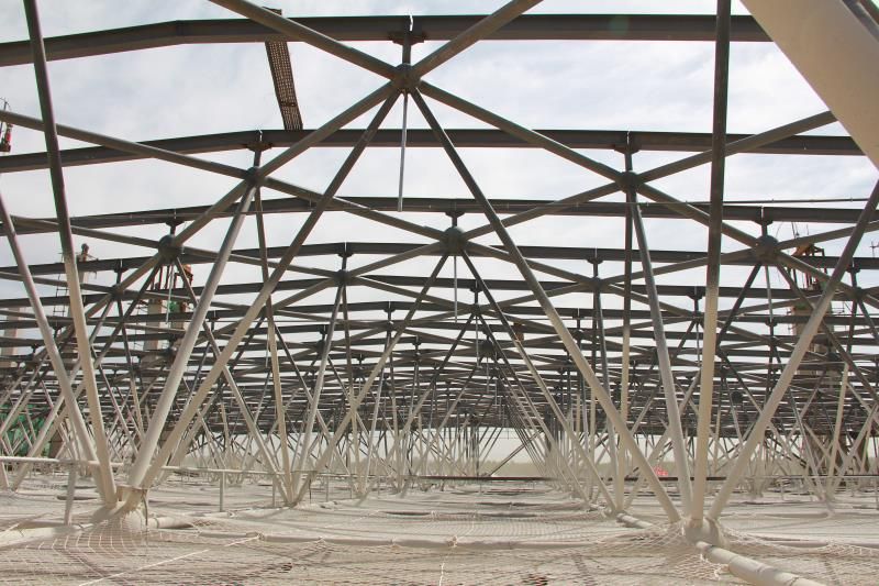该机库大厅网架跨度50米,进深59米,机库屋盖结构采用两层斜放四角锥钢网架,网架全部为焊接球节点。网架总重约142吨,针对工程的技术难度和跨度,项目团队采用了“地面拼装+整体提升”的方法完成钢网架提升。同时为了实现地面快速拼装,项目部根据工程施工组织部署,由机库大门沿进深方向拼装焊接错步施工。大厅网架拼装时采用3台25吨汽车吊拼装,在网架拼装焊接期间,相继完成提升支架及液压提升设备、安装与调试。