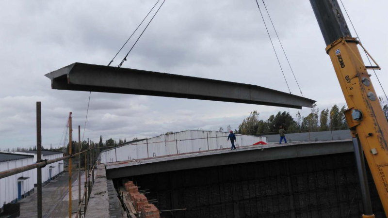 112生产厂房是本项目所有单体工程中施工最复杂、要求最严格的工程,112生产厂房屋面双T板共计250块,双T板长度共有5种类型,分别为16.8m、17.55m、11.8m、18.9m、21.43m,用300t吊车起吊安装。双T板为C50预应力钢筋混凝土。在起吊时,双T板两端按照对角线吊钩挂好直径为26毫米的尼龙编织绳,长度30米,对双T板进行牵引,防止碰撞。吊升速度必须缓慢有序,离地时进行试吊工作(离地约300㎜)确认吊臂、缆绳、吊钩安全后方可将双T板继续吊起,双T板起吊后旋转至砼框架梁上方,超过梁面约200㎜,然后缓慢下落在梁上,力求对准安装轴线依次吊装。双T板的安装完成标志着112生产厂混凝土结构全部完成,为完成既定6月30日投产的工期目标奠定了基础。