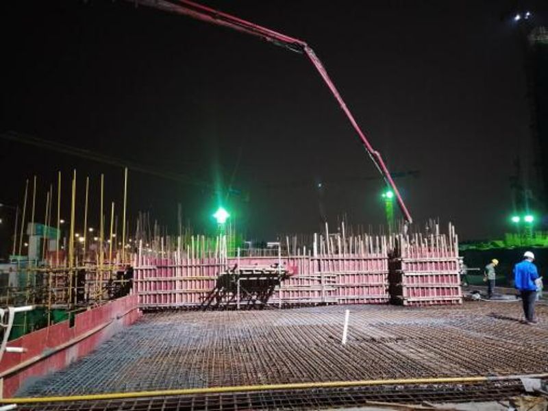 5月9日下午3点,该项目部技术员与人防监理及甲方现场负责人一同对6#楼地下室人防设施、支模架及顶板、梁钢筋进行检查,并于下午6点前整改完毕。下午6点40分,项目部技术员对6#楼地下室进行全面排查,确保整改完毕后,立即联系搅拌站进行当晚混凝土浇筑。7点30分,第一台62m泵车抵达施工现场,在寻到合适的作业地点后开始支设,8点10分时支设完毕,搅拌站开始发料,于8点25分开始浇筑混凝土,至11日上午11点20分浇筑完毕,本次混凝土浇筑共计765m³。标志6#楼地下室浇筑顺利完成。