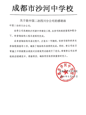 5月15日,由四川分公司承建的成都市金牛区沙河源中学工程再一次收到来自沙河源中学校方的表扬。