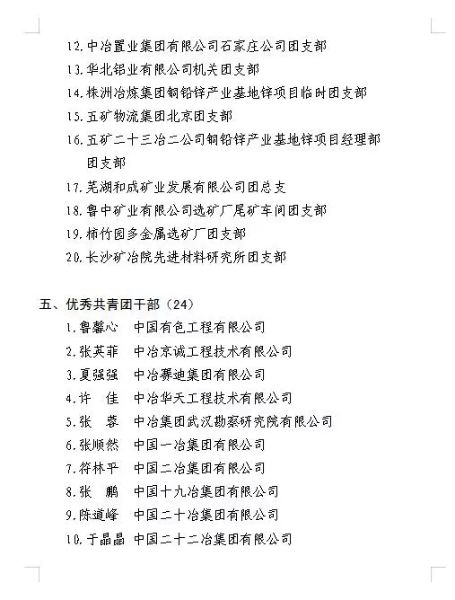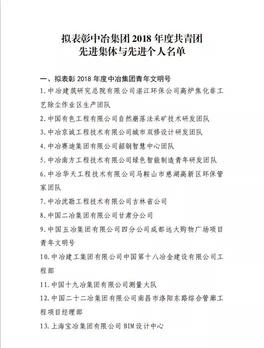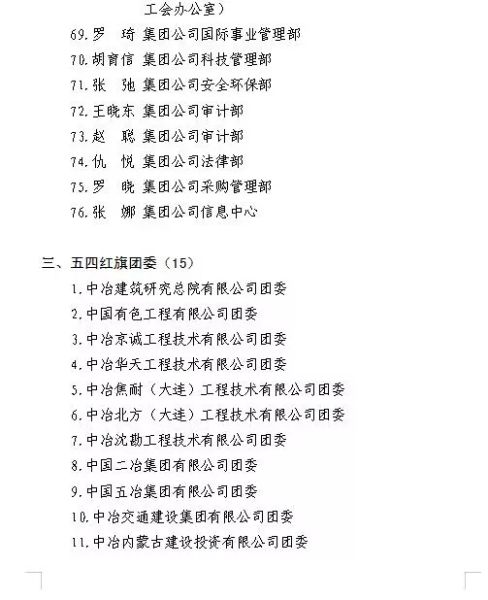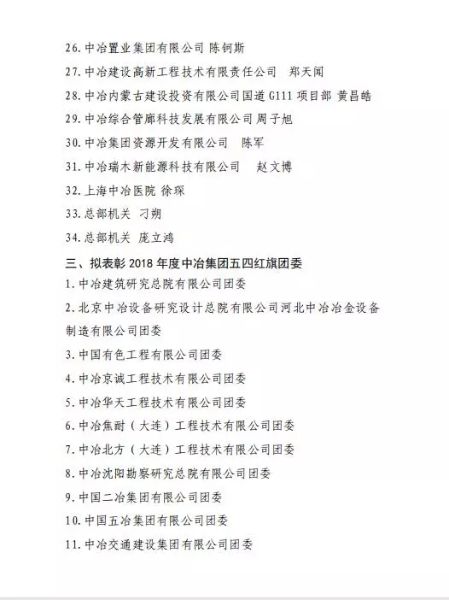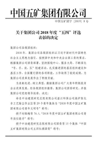 在中国五矿集团2018年度共青团先进集体、先进个人表彰会上,中国二冶集团有限公司团委荣获2018年度“五矿集团五四红旗团委”;中国二冶集团有限公司冶金分公司吴东想荣获2018年度“五矿集团优秀团员”;中国二冶集团有限公司内蒙古分公司符林平荣获2018年度“五矿集团优秀团干部”荣誉称号。