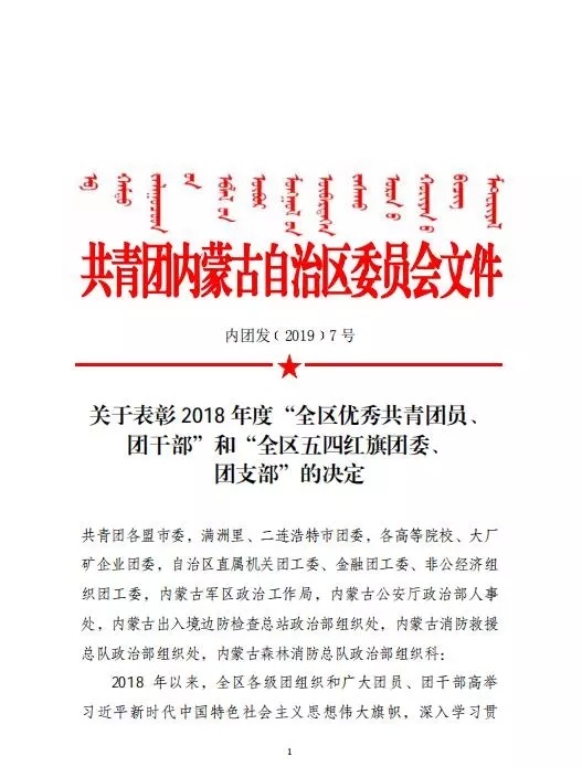 5月初,在共青团内蒙古自治区委员会表彰会上,中国二冶集团管道工程技术分公司团委荣获2018年度“自治区五四红旗团委”;中国二冶集团有限公司兰州大桥项目部团支部荣获2018年度“自治区五四红旗团支部”;中国二冶集团路桥分公司刘雨萌荣获2018年度“自治区优秀团员”称号。