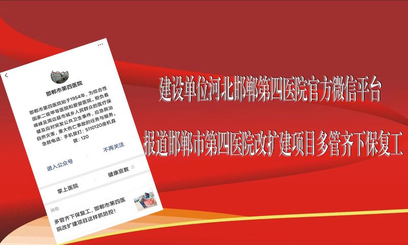 建设单位河北省邯郸第四医院官方微信平台报道中国二冶河北省邯郸市第四医院改扩建项目《多管齐下保复工,邯郸市第四医院改扩建项目这样抓防控!》