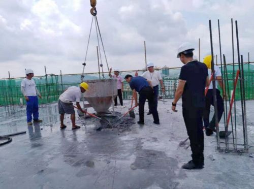 8月18日,在高温酷暑下的来宾市铜锣湾1号项目现场,作业人员配合有序,项目经理带头,其他各单位准备就绪,大家共同倒计时,将最后一立方混凝土成功填入1#楼,标志着宾市项目1#楼顺利完成主体结构封顶。
