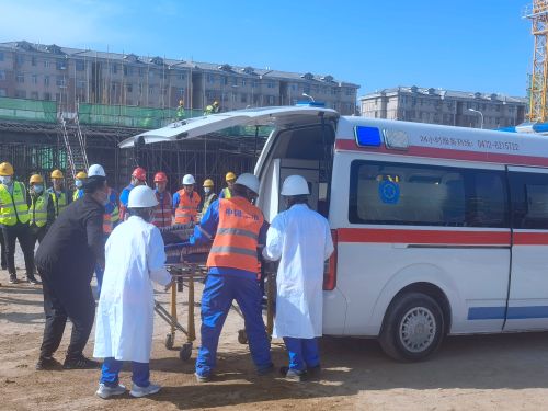 此次安全演练共分为三个部分。在“火灾事故应急救援演练”中,当电焊作业焊渣溅落并引燃旁边堆放的零星材料引发火灾时,现场作业人员立即大声呼救向项目部安全员报告险情。项目部安全经理立即指挥抢险救援组搬运消防器材赶赴火灾现场,警戒保卫组前往疏散相关人员并拉设警戒线,后勤保障组对事故现场进行进一步处理,避免现场存在的易燃物导致火势加强;在“高处坠落事故应急救援演练”中,当现场一名清理楼层垃圾作业人员坠落到地库底板地面时,其余作业人员立即大喊呼救并向项目部安全员报告险情。项目安全员初步判断现场情况后,立即通知项目安全经理请求下一步指示。安全经理立即启动应急预案,并安排安全员随即拨打120电话,等待救护车抵达现场。抢险救援组立即停止该楼层的一切作业,警戒保卫组疏散现场其余人员并拉设警戒线,医疗救护组对伤员进行了初步的医疗救治,五分钟后救护车抵达事故现场转运伤员;在“触电事故应急救援演练”中,现场拖地电线造成一名钢筋工触电,其余2名作业人员立即大声呼叫并及时向项目部安全员报告险情。项目安全经理得知情况后立即启动应急预案,拨打120急救电话。同时警戒保卫组疏散现场其余人员、拉设警戒线,医疗救护组立即奔赴事故现场,经过初步救治,触电人员的心跳和呼吸均已恢复,救护车抵达现场后立即转运伤员到医院进行进一步救治。
