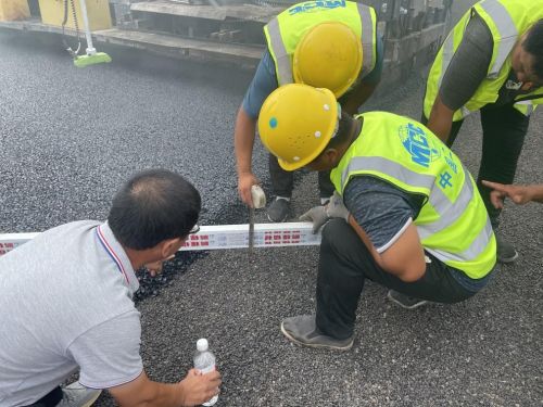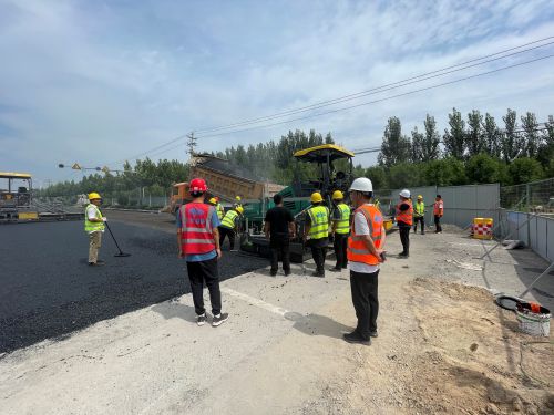 为确保沥青下面层试验段摊铺顺利,项目部积极与业主及监理单位进行沟通,并做好试验段摊铺前的技术安全培训工作,对试验、测量、设备操作等相关人员召开施工技术交底会等;在质量上,对施工方案进行细化、研讨,严格控制沥青混合料的拌合、运输、摊铺、碾压、检测等各个环节,保证质量可控。周密安排混合料拌和以及车辆运输、现场摊铺、碾压等各项工作。在温度高达160℃的沥青层作业面上,项目管理人员与一线工人密切配合,历经4小时的努力奋战,顺利完成了沥青下面层试验段的摊铺任务。