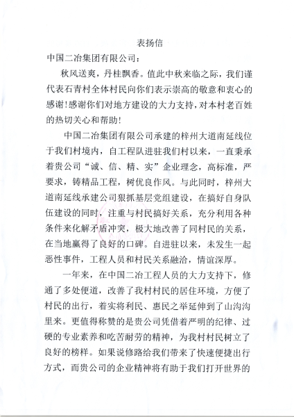 表扬信中指出,自中国二冶进驻我们村以来,一直秉承着贵公司“诚、信、精、实”企业理念,高标准,严要求,铸精品工程,树优良作风。与此同时,梓州大道南延线项目部狠抓基层党组织建设,在搞好自身队伍建设的同时,注重与村民搞好关系,充分利用各种条件来化解矛盾冲突,极大地改善了同村民的关系,在当地赢得了良好的口碑。自进驻以来,未发生一起恶性事件,工程人员和村民关系融洽,情谊深厚,多次慰问村中孤寡老人。一年来在中国二冶工程人员的大力支持下,修通了多处便道,改善了石青村村民的居住环境,方便了村民的出行,着实将利民、惠民之举延伸到了山沟沟里来。更值得称赞的是贵公司凭借着严明的纪律、过硬的专业素养和吃苦耐劳的精神,为石青村村村民树立了良好的榜样。