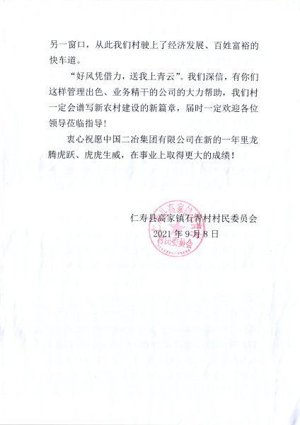 9月8日,眉山市仁寿县高家镇石青村村民委员会发来表扬信,对中国二冶承建的梓州大道南延线(省道424大林至仁寿段)工程项目改善村中建设表示衷心的感谢。