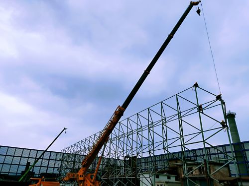 10月17日,昆钢项目B型矿石料场西侧山墙拼装工作正在如火如荼地进行。在两台50吨吊车的密切配合下,12名施工人员分为三组,仅用6个小时就完成了山墙基座的搭建。自此,B型料场所采用的“两侧山墙起步,中间合龙”格局正式成型!