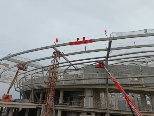 泰山文旅项目全民健身馆钢结构自2020年5月至今,项目部在公司领导下经过项目部全体管理人员及现场作业人员的共同努力,克服重重困难,在保障安全、提高质量的同时,倒排工期,优化方案,增调设备,紧密组织,科学安排,日夜赶工,在使用钢材3000余吨后终于迎来了封顶。