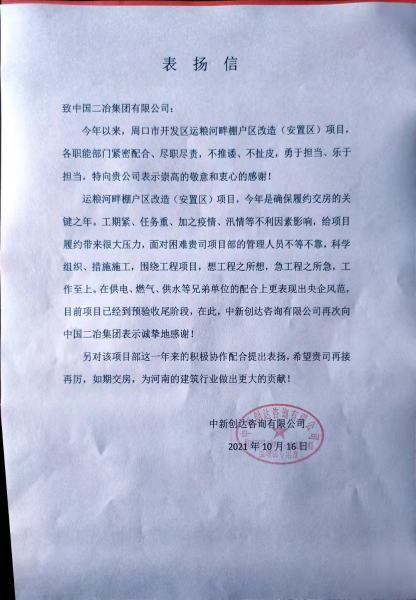 10月16日,周口市运粮河畔棚户区改造(安置区)项目喜获监理单位中新创达咨询有限公司的表扬信,对项目在管理过程中,勇于面对各种困难,积极配合工作的专业能力,表示高度的认可。