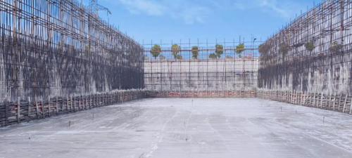 本次施工的事故雨水池及雨水收集池位于南厂区西南角,长70米,宽29.9米,深度为9米,总浇筑方量1440立方米,是本项目深度最大的子项。在施工过程中,基坑边坡支护以及大体积混凝土浇筑是施工的难点和重点。该项目在基坑土方开挖和大体积混凝土浇筑前根据设计图纸、国家规范编制了深基坑开挖方案,并经过了专家论证,以确保方案的规范性和可行性。并按照要求埋设了测温元件,定时测温,以便于控制温度,减少混凝土裂缝,保证工程质量。