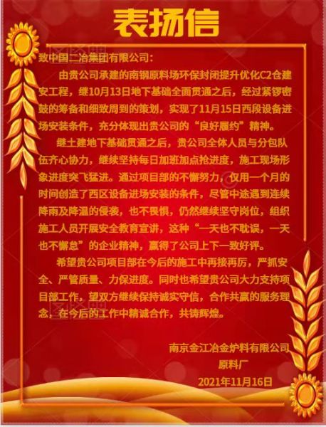 11月16日,中国二冶再次收到南京金江冶金炉料有限公司原料厂发来的表扬信,对中国二冶集团南钢项目实现11月15日西段设备进场安装条件,充分体现出的“良好履约”精神给予了高度评价。