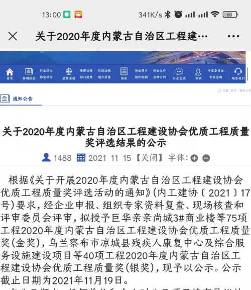 11月15日,内蒙古自治区工程建设协会公布2020年度内蒙古自治区工程建设协会优质工程质量奖评选结果,中国二冶钢构分公司蒙泰达拉特铝板带项目荣获优质工程质量金奖。