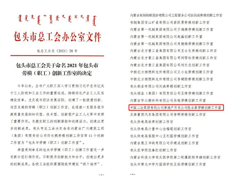 11月20日,中国二冶集团有限公司房地产开发公司张永革劳模创新工作室被包头市总工会命名为“包头市劳模创新工作室”。