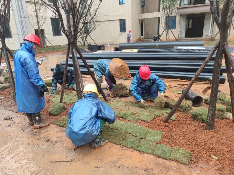 进入11月份,受全国气候影响,永州零陵区连续降雨达半个月之久,长期阴雨连绵的天气使得施工现场道路泥泞湿滑,周围绿化种植地松软,工鞋沾满淤泥,人工小推车运树运草更是难上加难。虽然天公不作美,但城建分公司永州项目部不为任何风险所惧,不畏任何困难,提前制定雨中施工安全、质量措施,出台详细的技术方案指导施工,保证园林绿化工程稳步推进。