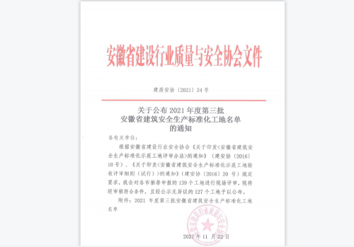 此次荣获“安徽省建筑安全生产标准化工地”,对于进一步提高项目部建筑安全生产文明施工管理水平具有重要意义。接下来,项目部将以此荣誉为契机,进一步激励全体管理人员继续以高标准、严要求的工作态度投身项目安全生产当中,促进安全管理标准化工作的再提升,铸造精品工程,彰显央企风范。