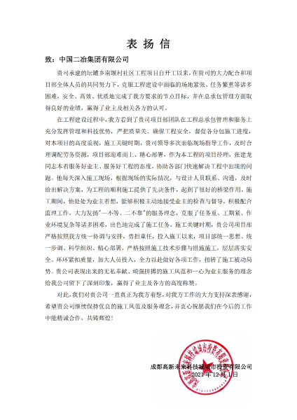12月1日,成都高新未来科技城城市投资有限公司致中国二冶表扬信。对中国二冶坛罐乡南堰村项目在建设过程中精心组织施工和辛勤付出给予表扬,同时对项目管理团队表现出顽强拼搏的施工风范高度赞赏。