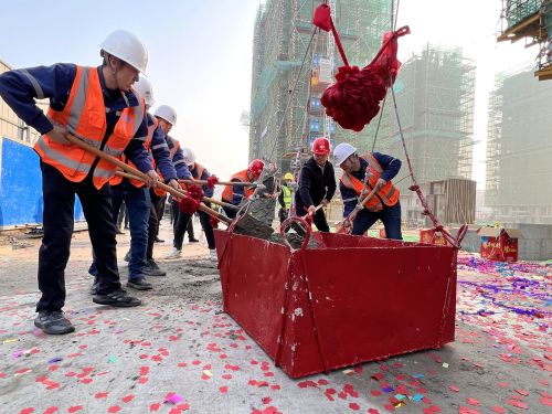 12月10日上午,由中国二冶路桥分公司承建的湖州南浔赏悦府住宅小区新建工程总承包项目再传捷报。伴随着七彩礼炮腾空而起,混凝土运料斗由塔吊缓缓提升至9#楼屋面,标志着该项目第一栋住宅楼主体结构封顶开始混凝土浇筑施工,这是继地下车库主体结构封顶后完成的又一重大工程节点。湖州南浔城市投资发展集团有限公司、湖州南浔金象地产控股集团有限公司相关领导,赏悦府项目部领导班子及全体参建人员参加本次封顶仪式。