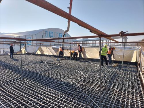 该项目部现场管理人员在完成所有技术、安全交底后,一声令下,第一节段箱体预制开始浇筑混凝土。第一节段箱体宽16.4米,一次浇筑600方混凝土,过程持续了20余小时。在最后一方混凝土成功浇筑后,大家也并没有就此放松,一刻也不敢懈怠,立刻进行保温措施,防止冬季施工中出现质量问题。