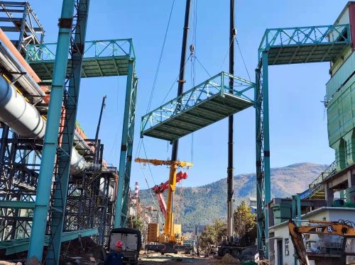 昆钢原料场全场共有钢结构通廊166段、总长合计4.8公里,钢材总重量8900多吨,每次吊装前项目部都运用电脑软件Tekla进行演算试验,达到百分百过孔率,确保一次吊装成功。此次吊装的通廊GJ206/GS207通廊,全长21.5米,宽6.9米,吊装高度高达33米,横跨厂西大道,是通廊吊装难度较大的一段,对作业人员操作要求极高。吊装前,项目部对吊装的吊具、绳索进行反复检查并进行试吊,防止发生高空作业坠落事故和安全事故的发生。项目部领导班子成员上阵一线,指导配合吊装队伍进行作业,吊装过程采用两台300吨吊车同时作业,确保了整个吊装过程安全稳定。