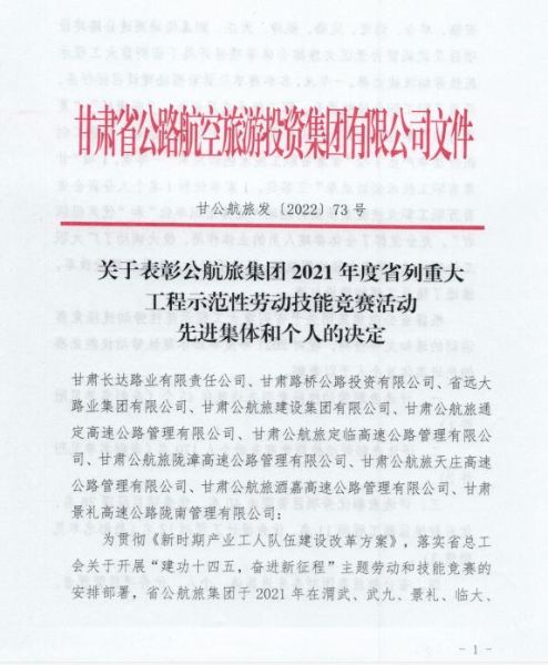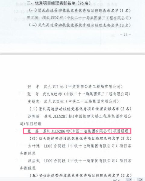 3月20日,甘肃省公航旅集团下发通知,对获得甘肃省公航旅集团劳动技能竞赛先进集体和个人进行表彰。中国二冶景礼项目部项目经理张磊荣获“优秀项目经理”。