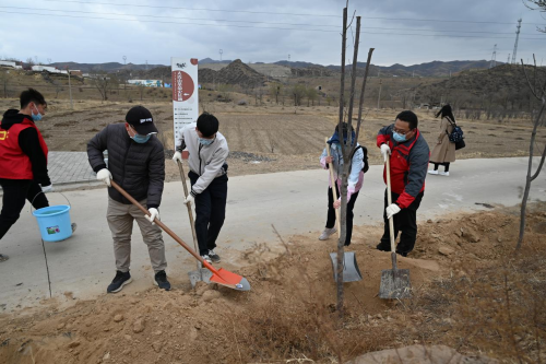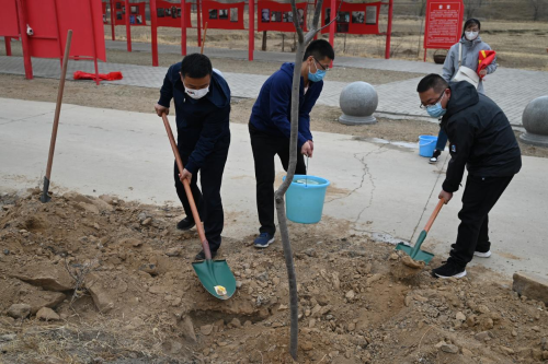 在植树活动现场,一抹抹亮丽的志愿红、一个个忙碌的身影成为春日大地上的靓丽风景。工作人员为团员青年们进行了树林栽种知识科普讲解,并在现场来回奔忙,进行技术指导。全体人员兴致勃勃地拿起铁锹,一起投入植树活动中。大家三人一组,五人一队,分工明确、通力合作,有的奋力挖坑铲土,有的挥锹填土,有的扶苗,有的浇水,一丝不苟地完成着每一道工序,力争做到保质、保量、保成活。植树现场繁忙有序,绿化家园热情高昂。部分志愿者在青山村周边开展了捡垃圾,平整路面等实践活动。
