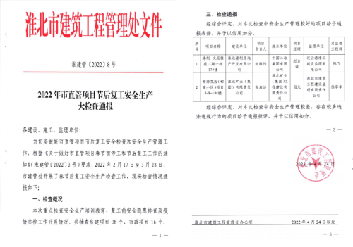 4月24日,淮北市建筑工程管理处下发《2022年市直管项目节后复工安全生产大检查通报》文件,由华东分公司承建的港利·文庭雅苑项目在抽查的54个项目中脱颖而出,受到通报表扬。