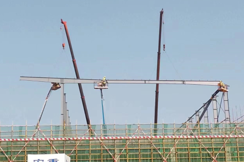 4月26日上午9时,泸州老窖项目包材中心第一根钢梁成功吊装,标志着钢结构安装全面进入屋面安装阶段。